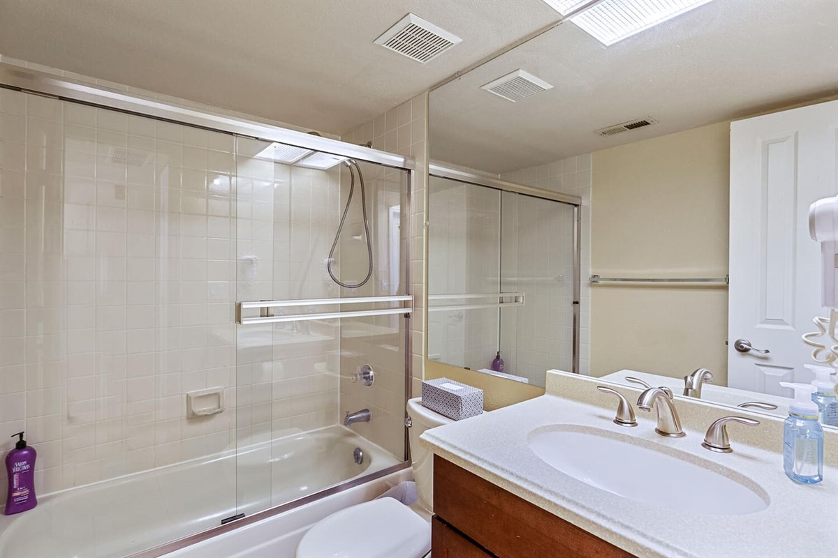 Bathroom: Bright and fresh with a new vanity, starter toiletries, and plenty of towels provided.